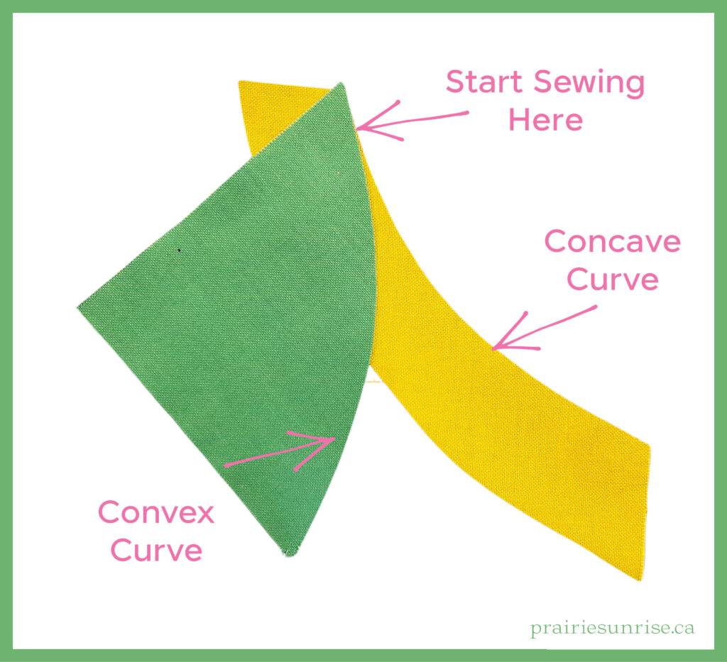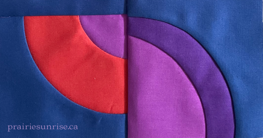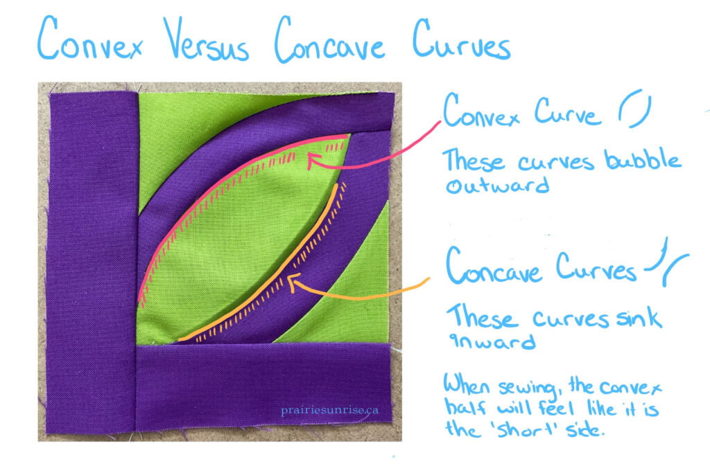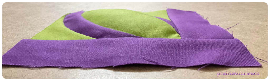 Stretching: I think sewing with the concave shape on the top helps to avoid the dreaded pucker. Cutting a curve results with fabric cut on the bias, which makes the fabric a bit stretchy. I know I definitely pulled the purple concave curves a bit as I sewed (manipulating it around the curve). If the purple gets pulled longer than it should be while the green maintains its shape – puckers will ensue.